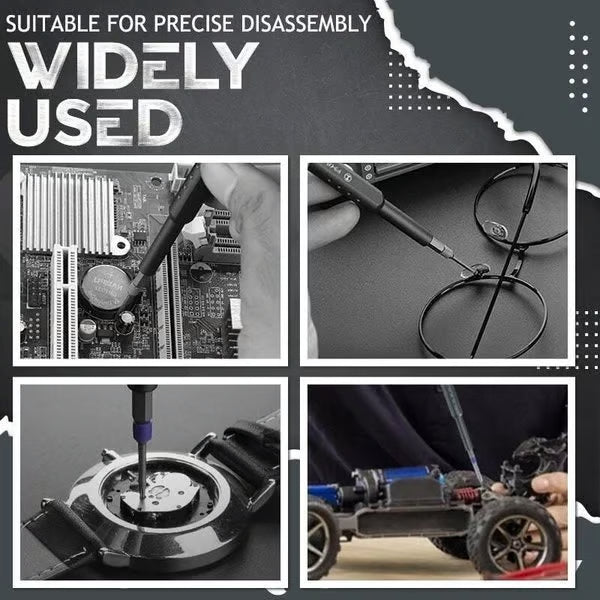 This screwdriver set has 28* conventional and precision bits. 1* screwdriver. 1* tweezers. 1* pry bar. The upgraded extended drill bit is 10mm longer than the ordinary one. which is convenient for disassembly and assembly of deep screws.